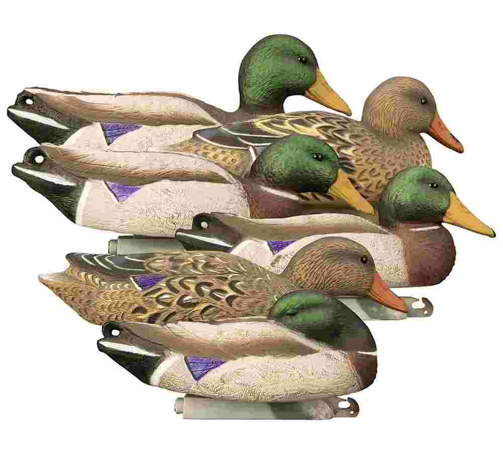 Bulletproof realism has definitely been taken to the next level with this Foam Filled decoy package. This Full-Size mallard pack has all six decoys with different head positions including new skimmers and a new sleeper drake! Drakes feature bright green heads with highly detailed feather carving. The Hens are masterfully carved with rich golden tones and bright contrast. Full-Size decoys are built to the average size of a live duck. These are perfect for any duck hunter looking for the industry's best durability and realism in a natural size decoy. Weighted keel for quick and easy set-up. Keel allows short stringing decoys for shallow water. Higdon's highly detailed proprietary UV painting process and deep realistic carving techniques highlight each individual feather and minimize unnatural glare even when decoys are wet. Our paint won't peel or fade so your decoys will look great season after season. Package includes: 1 Upright Drake 1 Skimmer Drake 1 Resting Drake 1 Sleeping Drake 1 Relaxed Hen and 1 Skimmer Hen. As a Ducks Unlimited Official Licensed Product a percentage of your purchase will go toward wetland conservation.